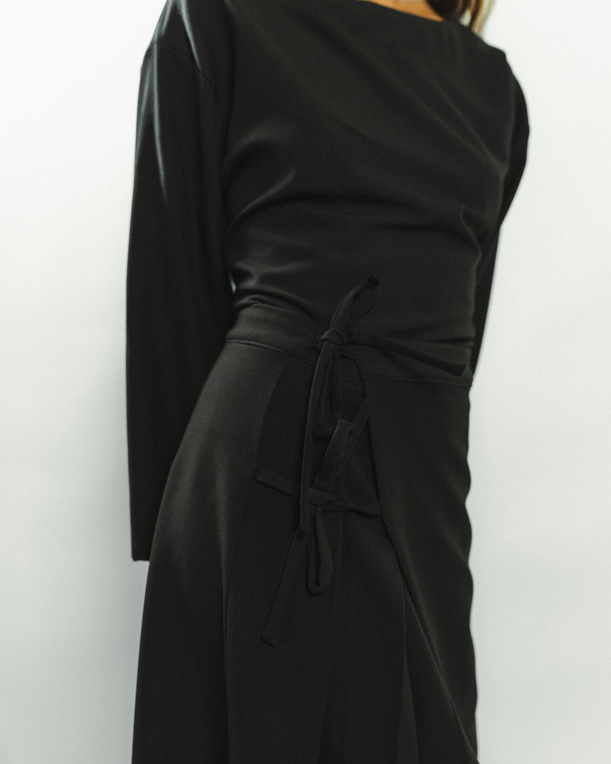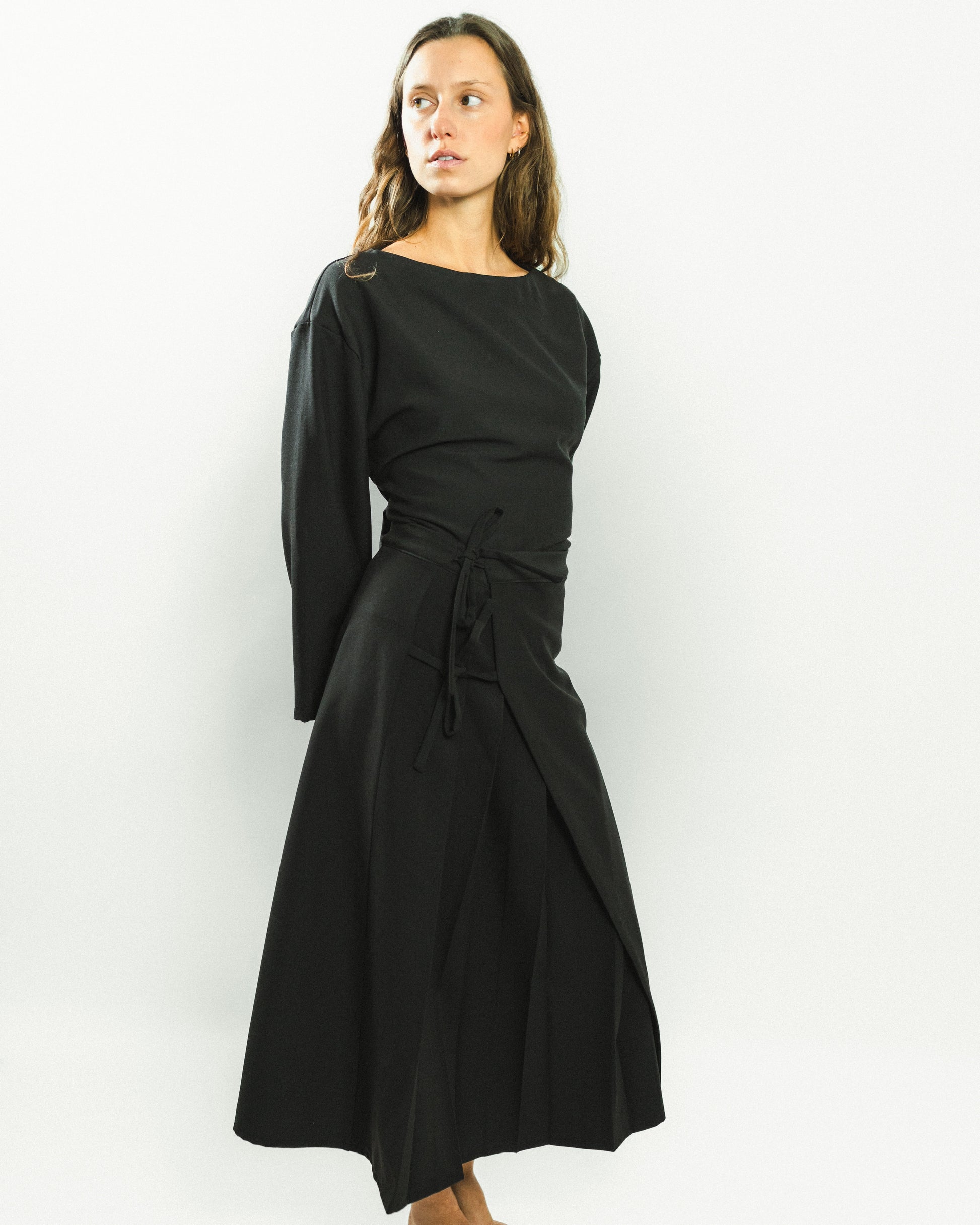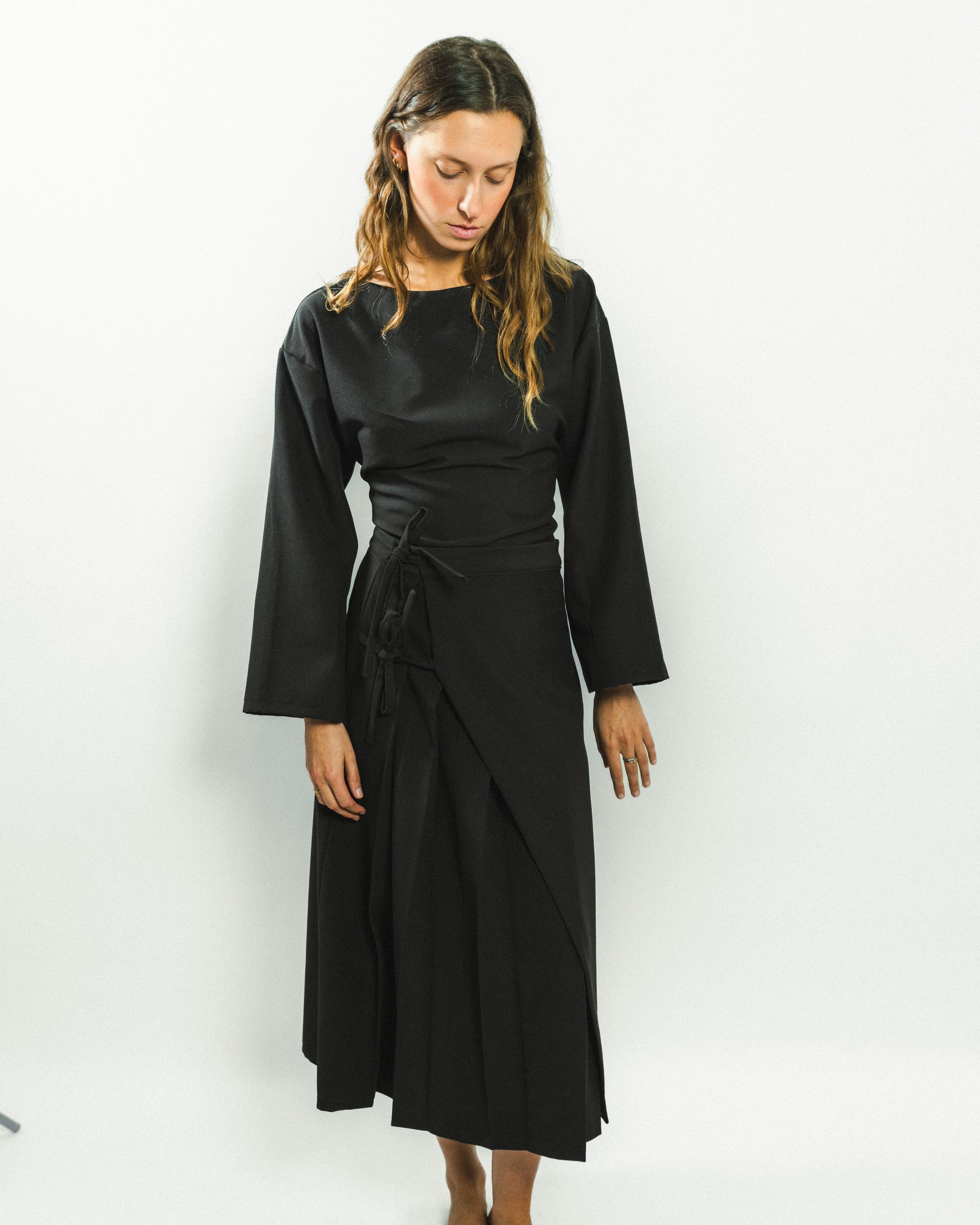 Jupe portefeuille qui se ferme à l'intérieur par deux boutons pressions, permettant d’ajuster facilement la taille. À l’extérieur, deux liens noués maintiennent le pan supérieur, qui s’évase légèrement pour dévoiler le pan inférieur en plis plats. Une coupe dynamique et élégante, inspirée du pliage japonais.