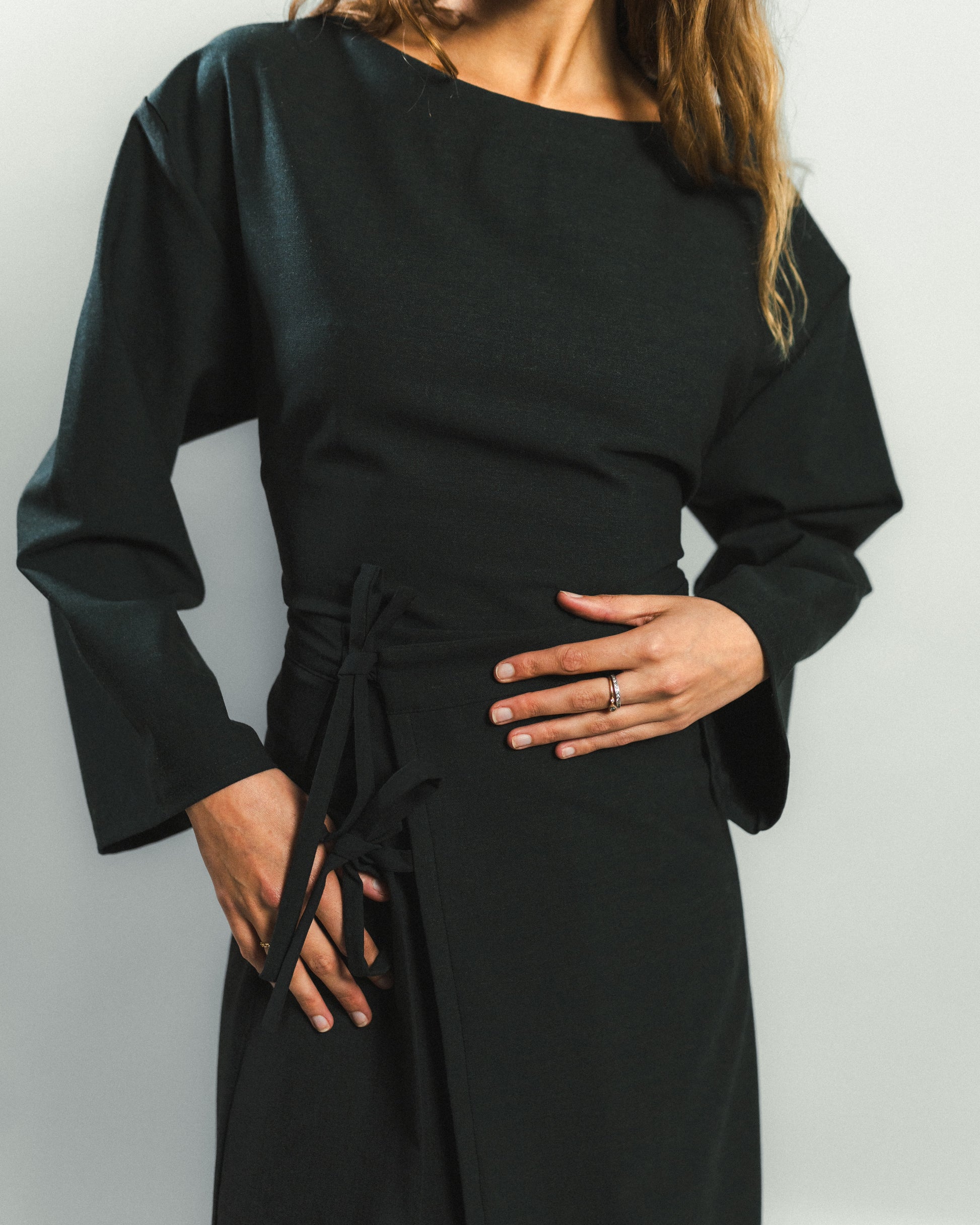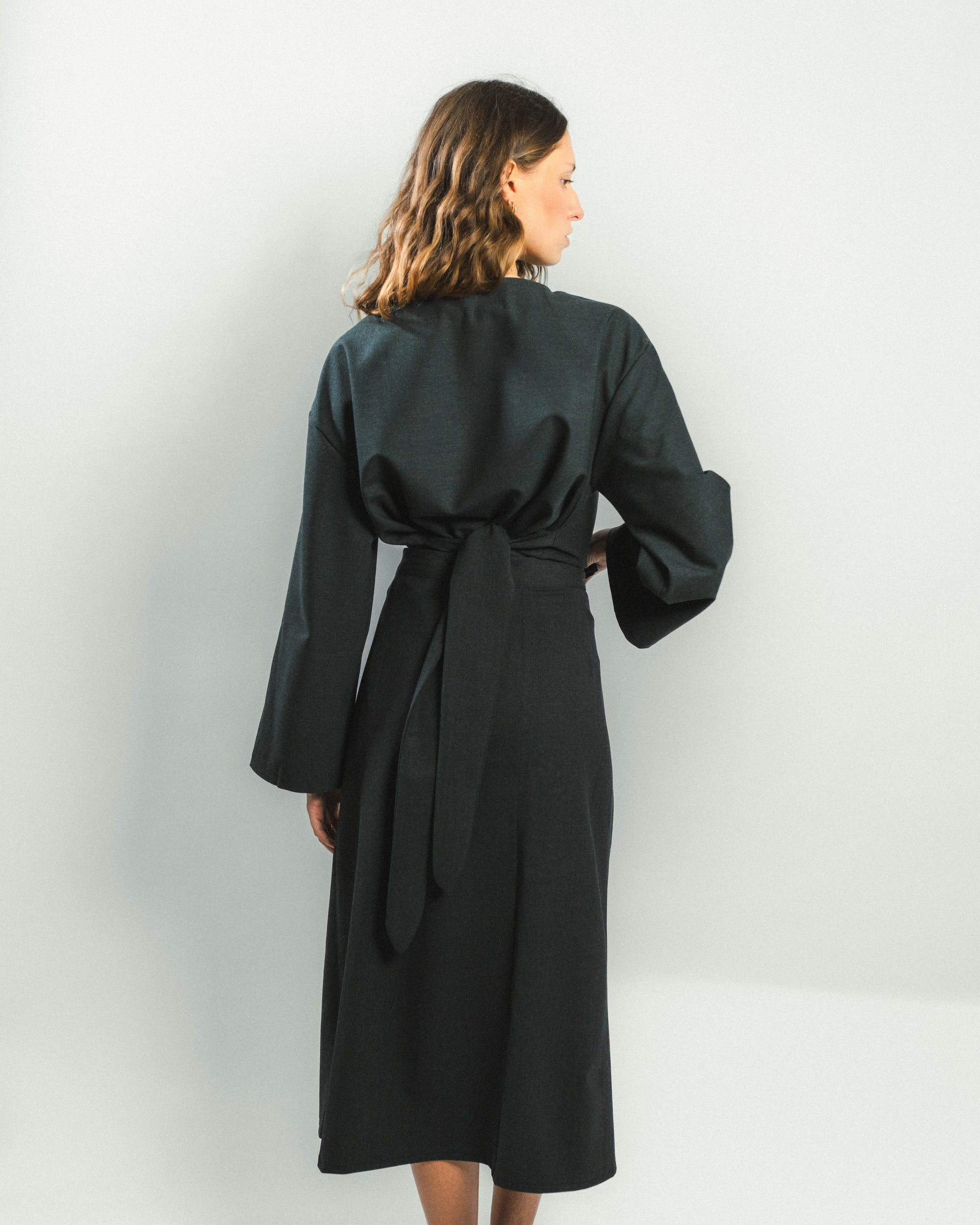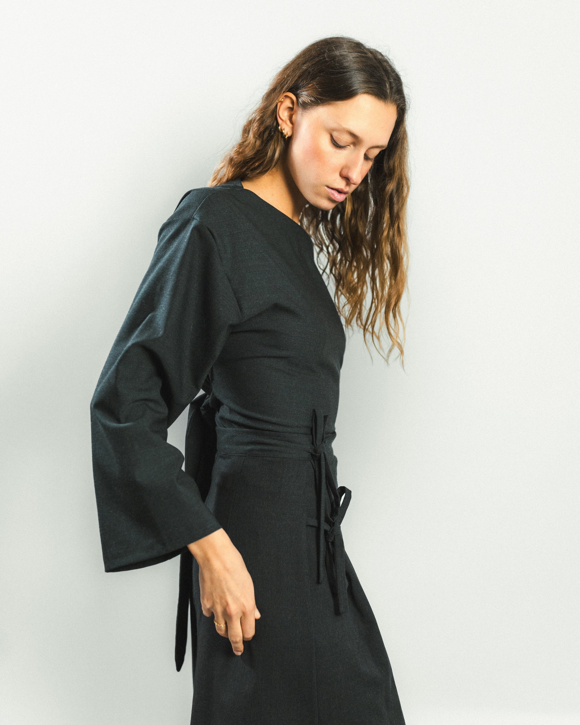 Jupe portefeuille qui se ferme à l'intérieur par deux boutons pressions, permettant d’ajuster facilement la taille. À l’extérieur, deux liens noués maintiennent le pan supérieur, qui s’évase légèrement pour dévoiler le pan inférieur en plis plats. Une coupe dynamique et élégante, inspirée du pliage japonais.