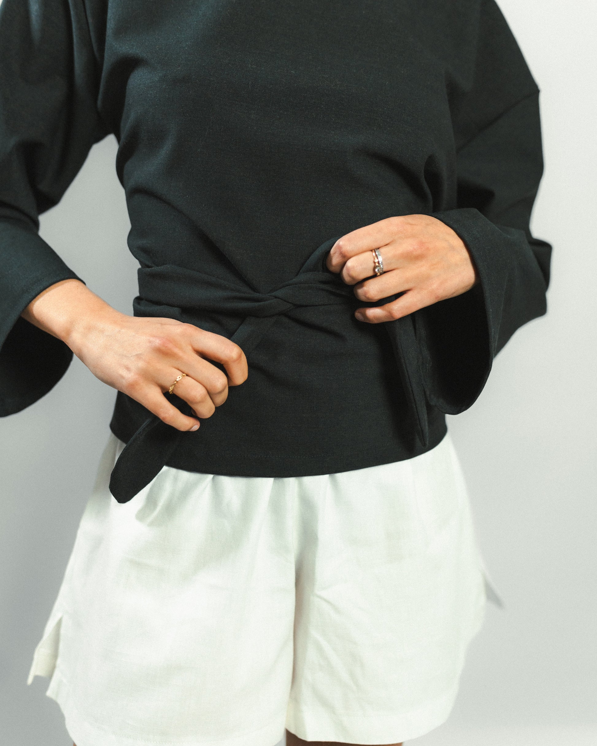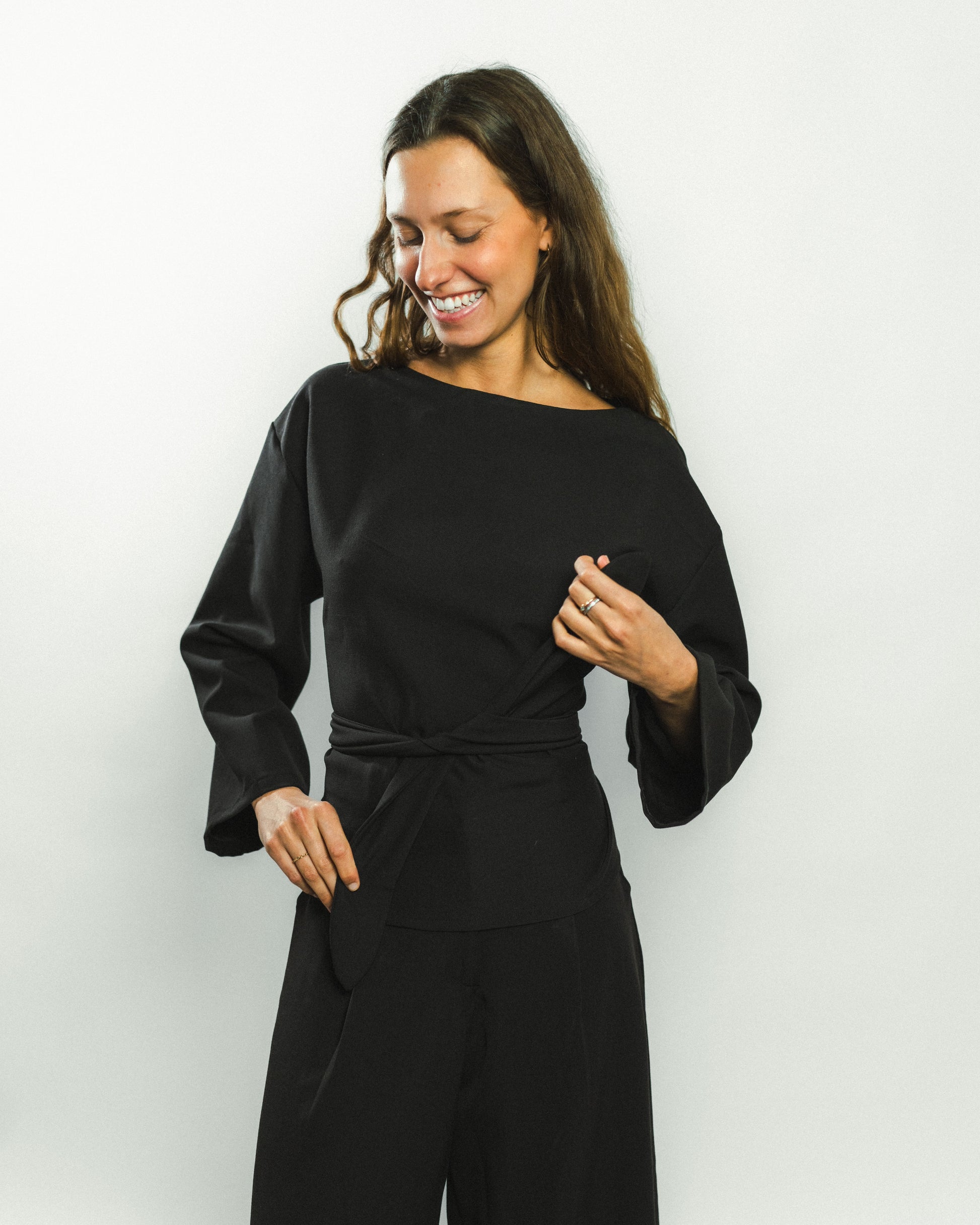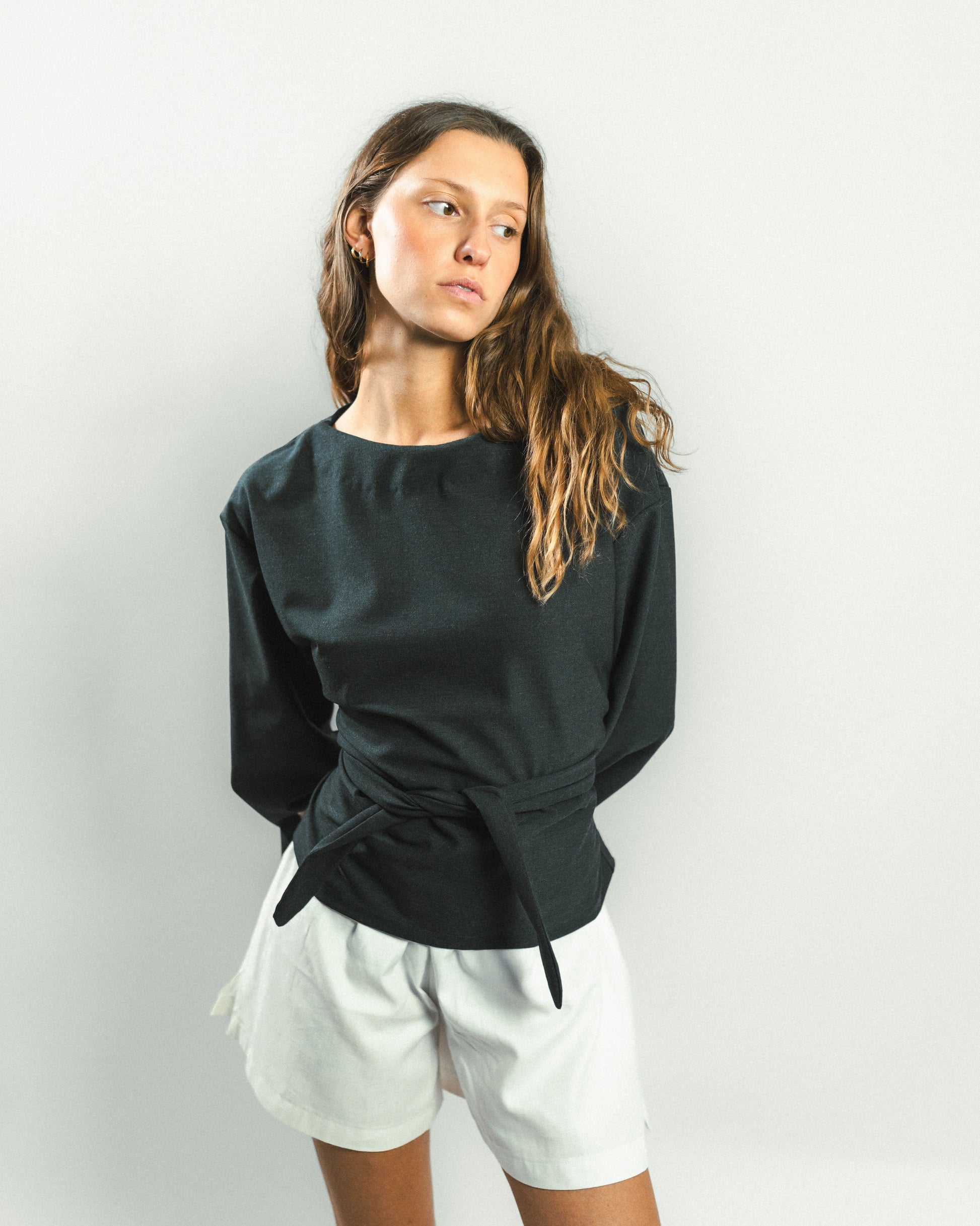 Top pull oversize, manches longues évasées, peut se nouer de différentes façon pour le cintrer plus ou moins et mettre sa silhouette en valeur