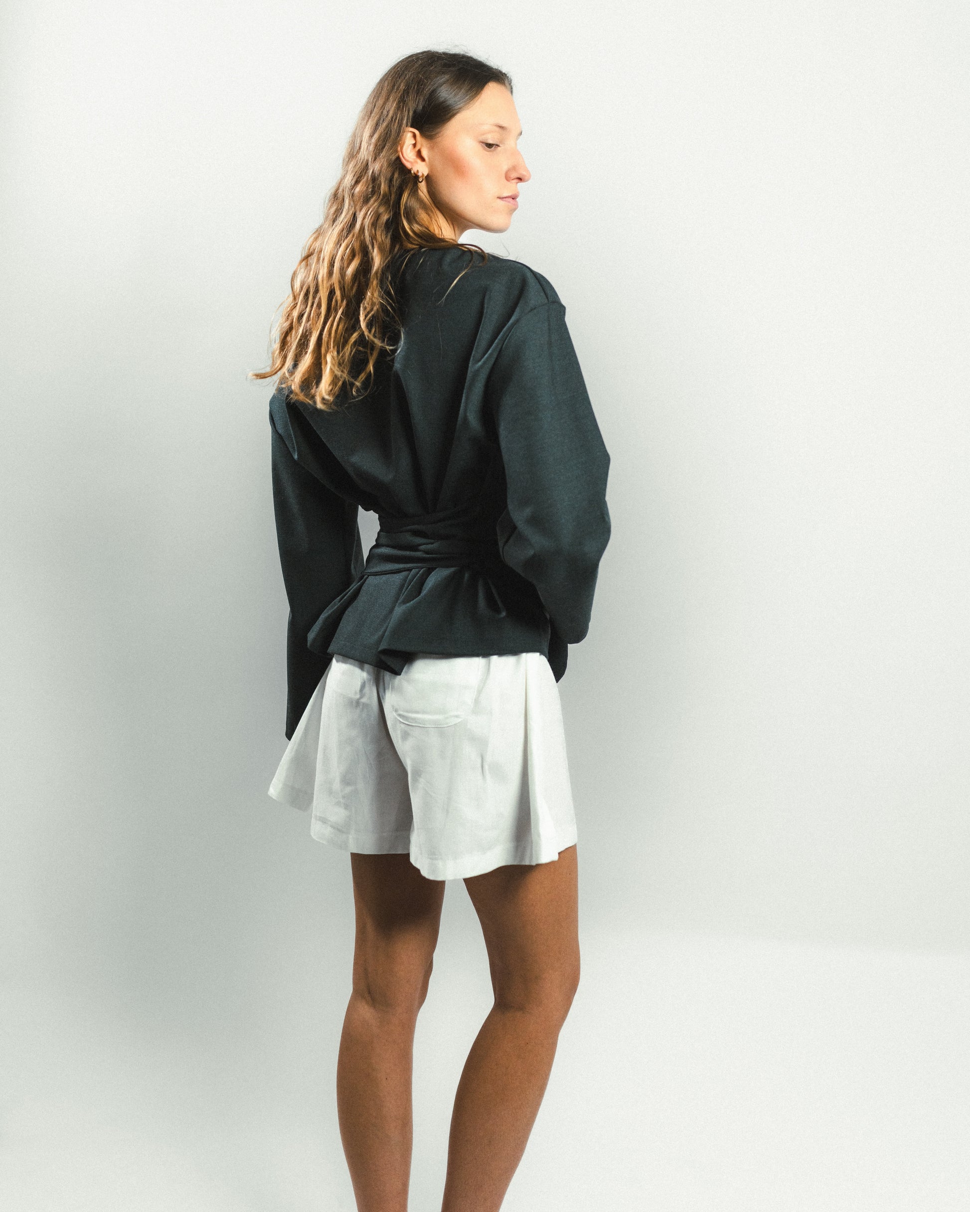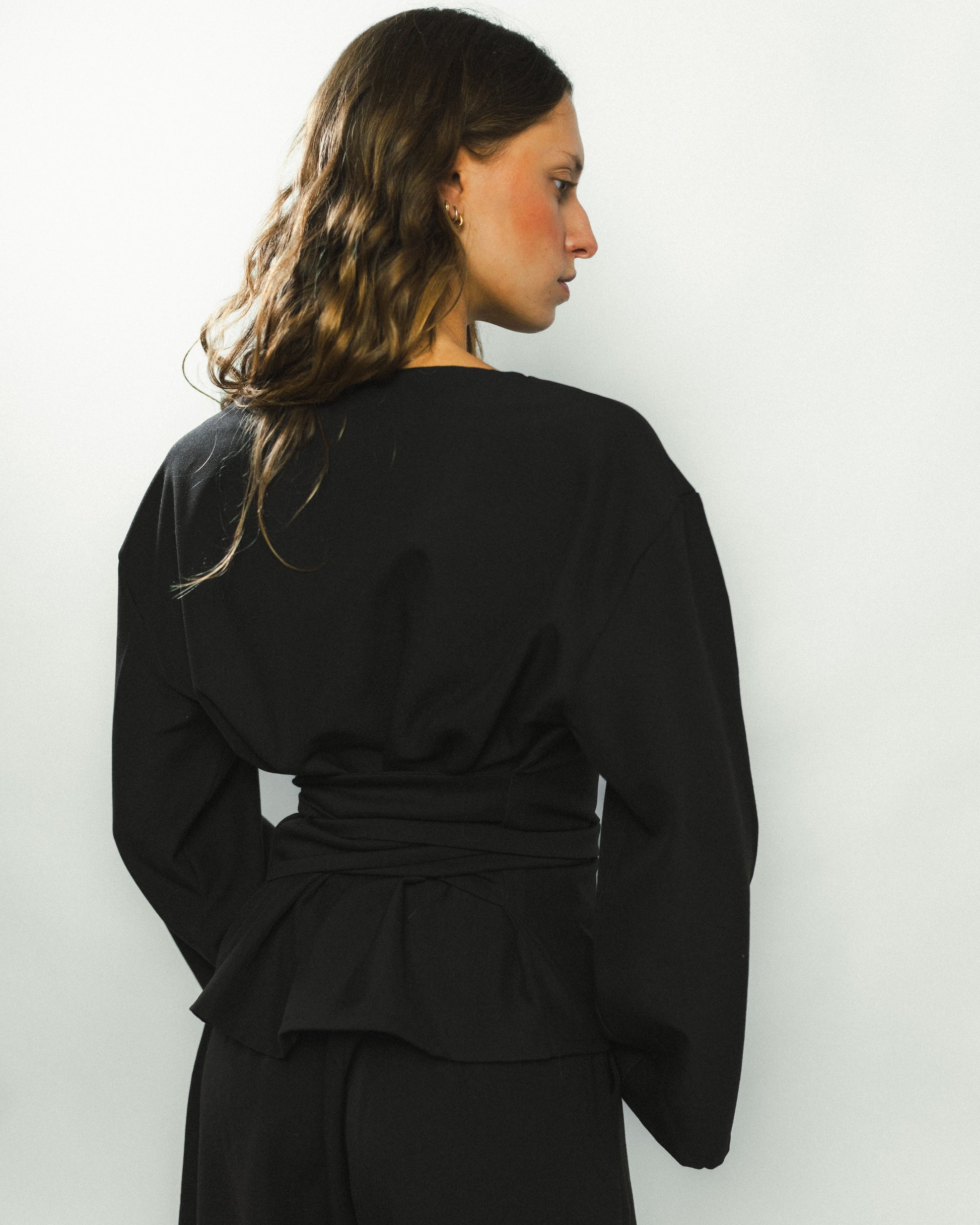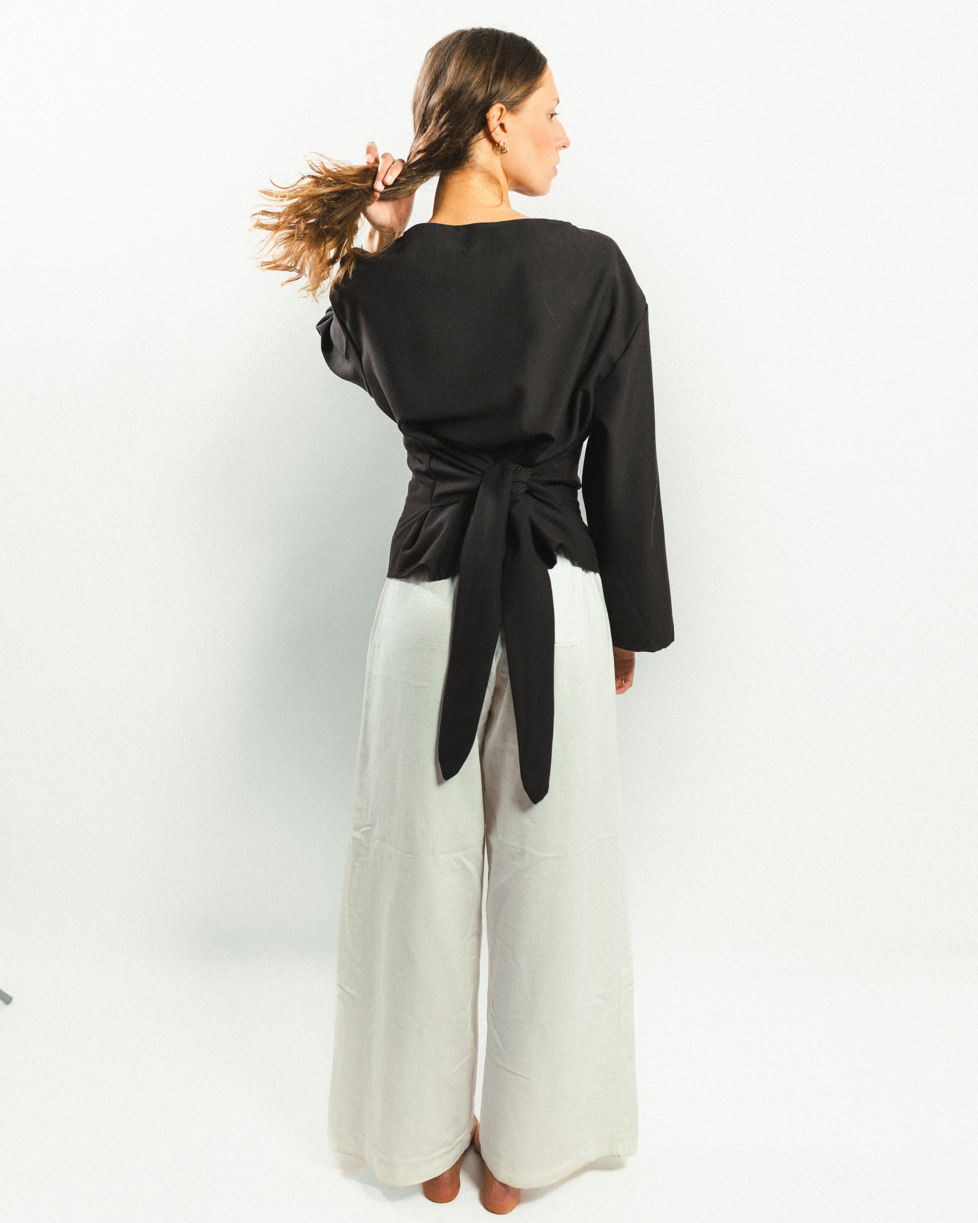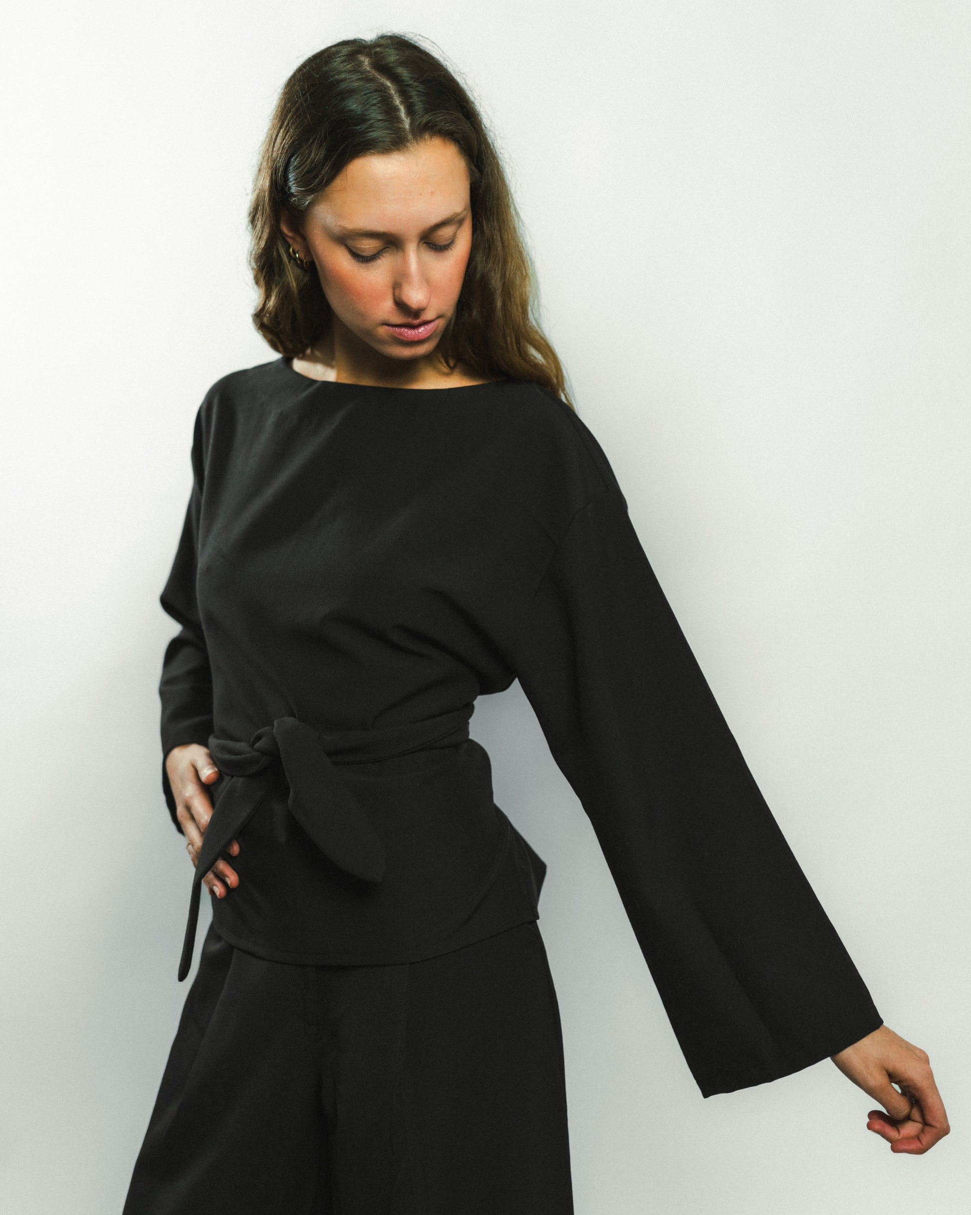 Top pull oversize, manches longues évasées, peut se nouer de différentes façon pour le cintrer plus ou moins et mettre sa silhouette en valeur
